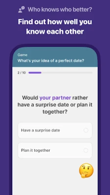 💬 Questions and conversation starters: Unleash deeper dialogue! Explore insightful questions designed to provoke thoughtful discussions. Responses stay hidden until both of you have answered, ensuring honesty and spontaneity.