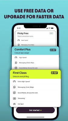 Firsty Free – €0/day: Included basic data for essential apps like WhatsApp, iMessage, and Google Maps. Watch a short ad to keep data active.
