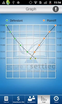 Some of that intelligence has been made available in this free app. Picture It Settled™ Lite tracks the dollar moves in negotiation. But, perhaps more importantly, it also tracks the time interval between offers. The app then takes that offer history and extrapolates it out in both dollars and time to help the parties picture whether and when they might reach a deal. The actual offers are connected by solid lines and the extrapolations are dotted.