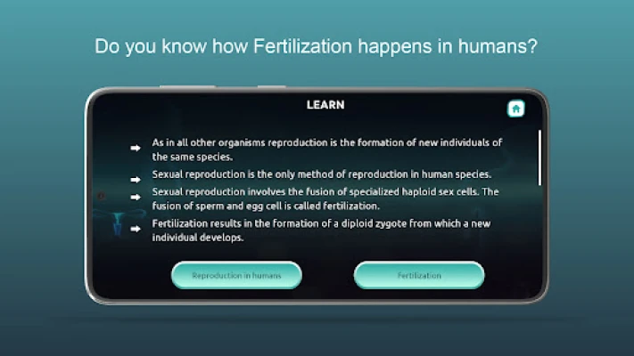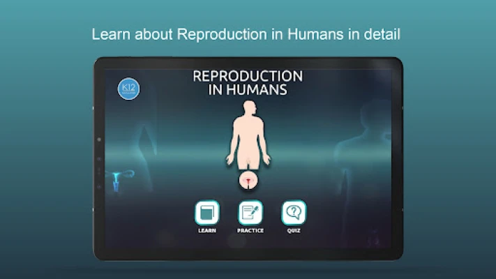 Features: Learn – Explore concepts related to human reproduction, including fertilization and the reproductive system. Practice – Engage with interactive activities for better understanding. Quiz – Test your knowledge through a quiz section.